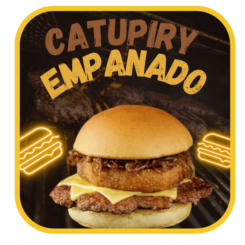 PÃO BRIOCHE TOSTADO NA MANTEIGA, 1 BIFE SUCULENTO DE COSTELA BOVINA DE 150gr, 1 FATIA DE CHEDDAR, 1 DISCO DE CATUPIRY EMPANADO SUPER CROCANTE E UMA DEELICIOSA GELEIA DE BACON.